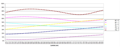Fig. 1. Diffraction efficiency measurement of the UV TROPOMI 2400gr/mm blazed holographic plane replica grating from 270nm to 330nm, for TE, TM polarization of 0th and 1st order.