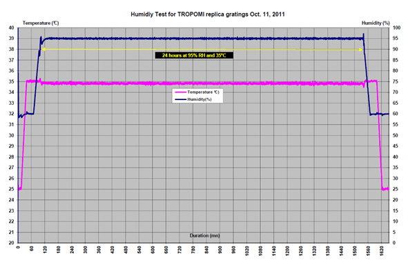 The QM grating has been used for performing successfully environmental tests (temperature cycling from -50°C to +45°C and humidity test at 35°C and 95% RH) according to the TROPOMI space-flight mission requirements (Fig. 3).