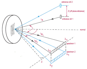 The illustration shows a "super corrected grating" imaging two independent sources onto two independent linear arrays. Spectrum 1 is a "sample spectrum" from slit 1and spectrum 2 a reference spectrum from slit 2. These "slits" could be fiber optic inputs.