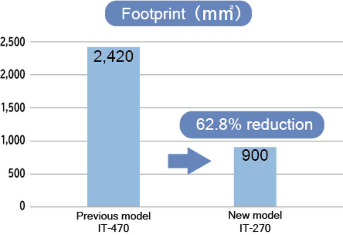 As for the “eco-friendly products”, the internal structure has been optimized to reduce the footprint by 62.8% compared to the previous model, realizing a smaller and more compact structure. It contributes to flexible layout design when incorporating into production line equipment in a wide range of industries, including semiconductors and aluminum.