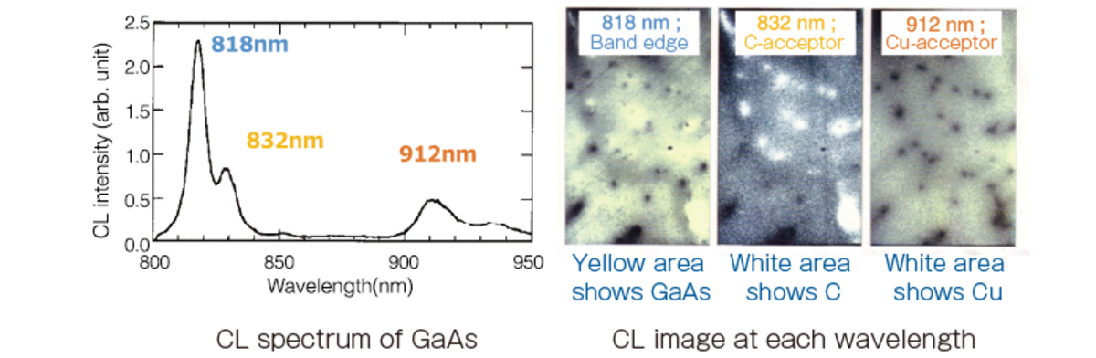 We analyzed the spectrum of GaAs wafers using cathodoluminescence (CL) and confirmed the peaks of each level that contribute to light emission. As a result of acquiring CL images for each peak, we were able to confirm that carbon and copper were scattered.