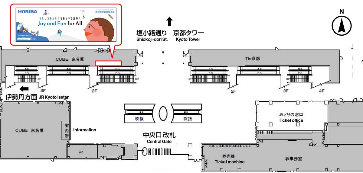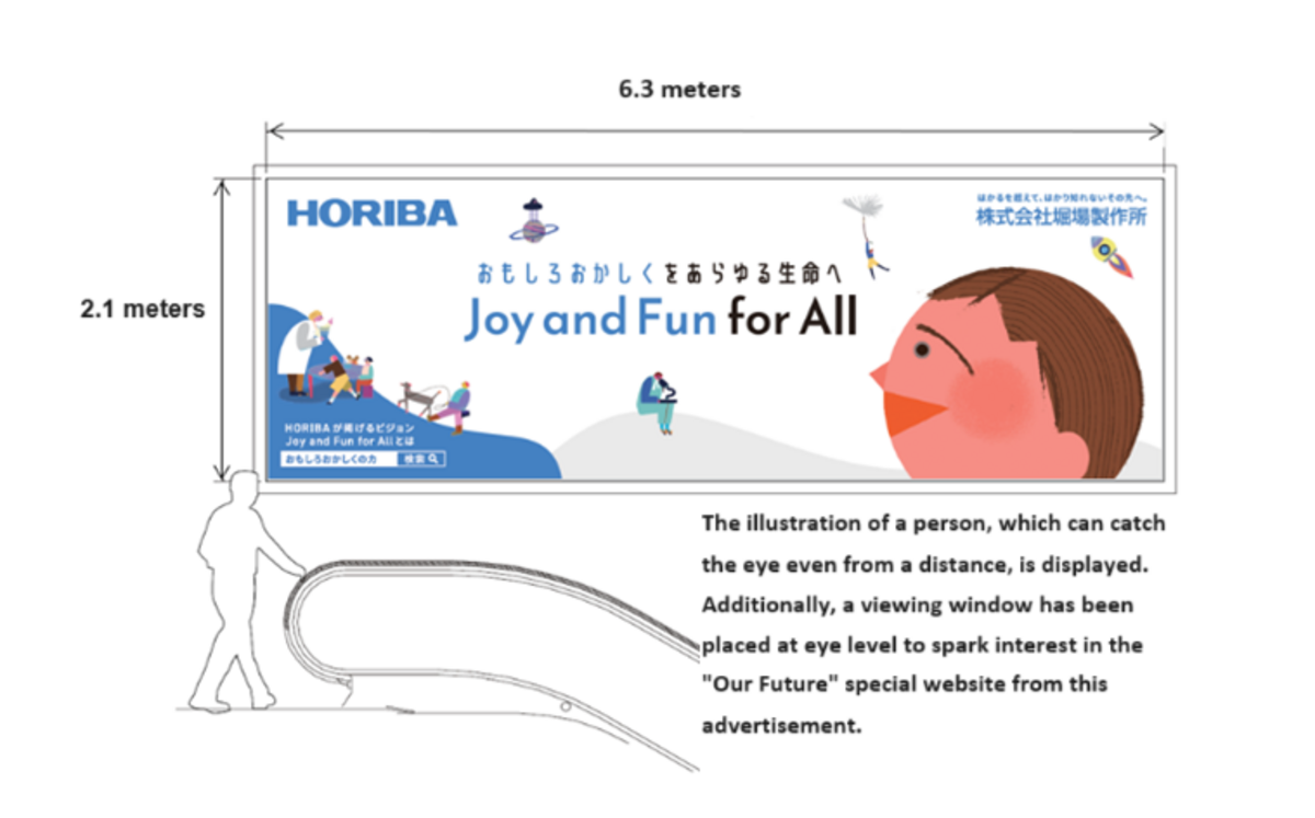 Embrace the essence of "Our Future" as HORIBA’s inspiring vision, mission, and values come to life in this captivating advertisement. We hope that everyone who sees the billboard feels curious and intrigued by our vision: "Joy and Fun for All." As you step out of the Central Gate, let the delightful visuals of the "Our Future" special website greet you with warmth. This billboard is set to become a new landmark of JR Kyoto Station, an exciting addition sure to catch the eye of every visitor. Don't miss out on this incredible installation that promises to become a new highlight of the area.