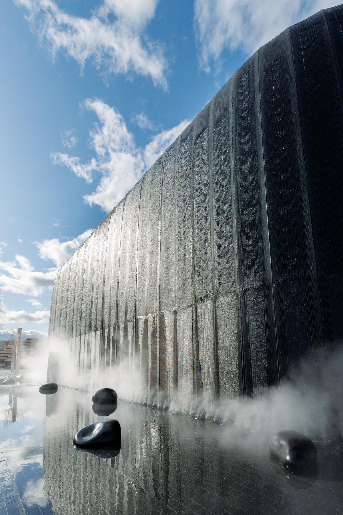 “Future of Life” Pavilion: The black exterior walls of the building are intermittently covered with flowing water, creating a “Shores” scene together with the waterscape.