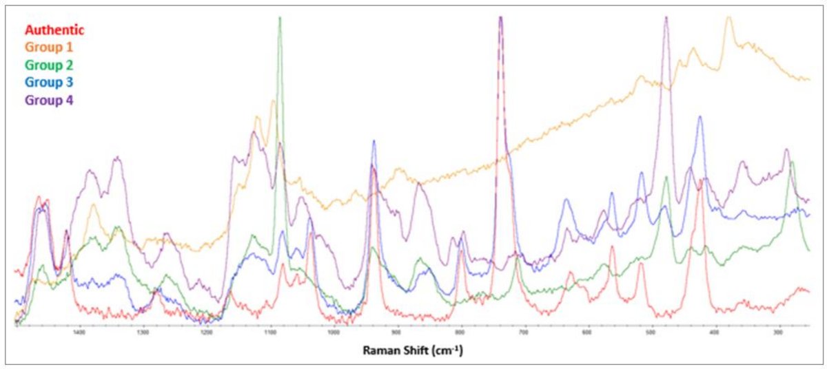 Raman spectra for authentic and four different types of counterfeits of the authentic product.
