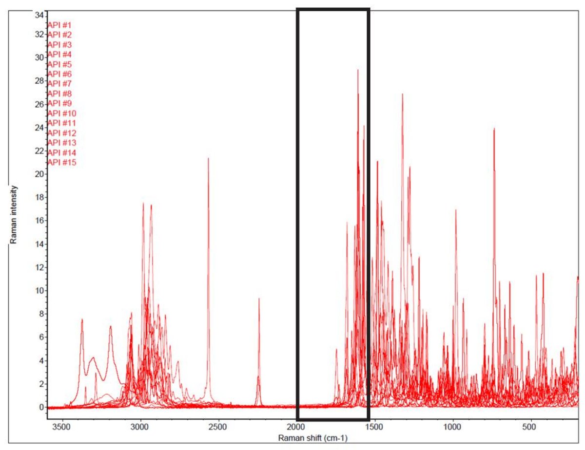 Raman spectra of 15 common Active Pharmaceutical Ingredients (APIs), 1550-1900 cm-1 region highlighted with a box.