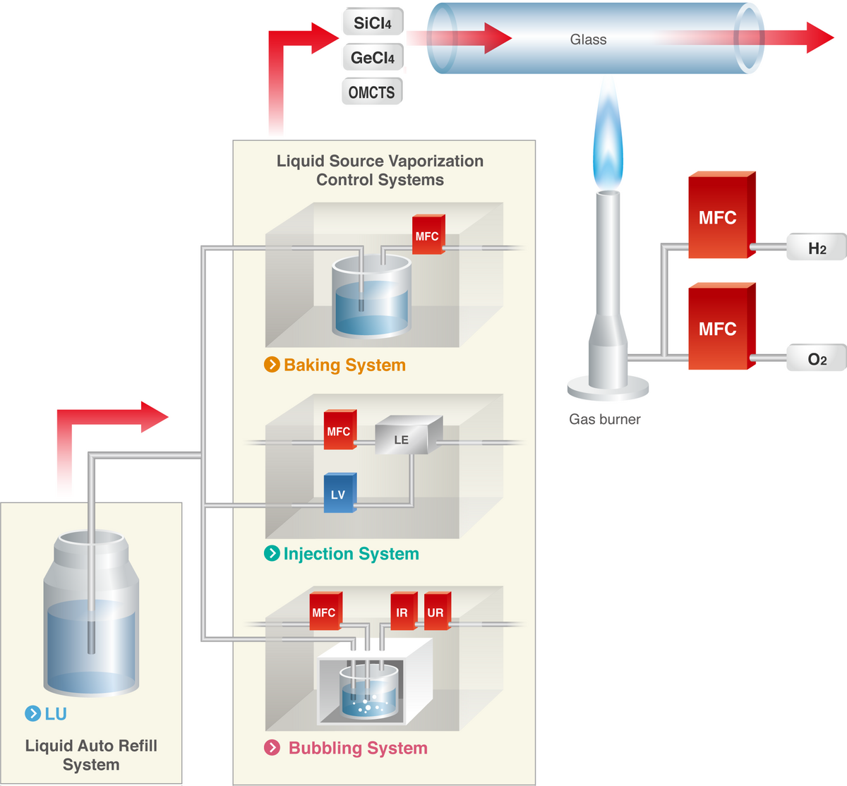 When manufacturing fiber optics, plasma torch gas control is critical to the process. HORIBA’s flow measurement and control technology is used to accurately and repeatedly control the flow rate of these gases. To create a preform, fiber optics manufacturers can use POCl3, SiCl4 and GeCl4 delivered via a bubbler system or hotbox. Precise and repeatable control of the vaporization process is contingent on the precise operation of the bubbler / hotbox and tight control of the carrier gas.