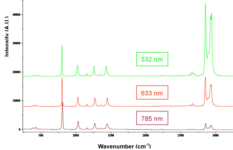シクロヘキサンのスペクトルを以下に示します。各波長のHEシステムと適正なSuperHeadTMを用いて記録しました。