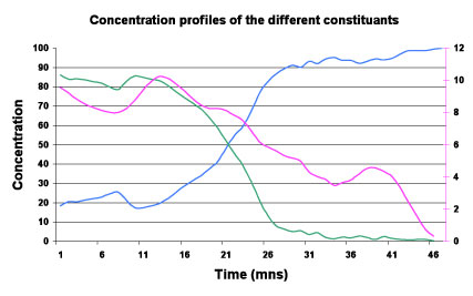 この図は重合反応を確認するために部分最小二乗法を用いた結果を示しています。この反応では2つのモノマーが反応し減っていき、新しくポリマーが造りだされていることが確認できます。興味深いことは2つのモノマーが反応している過程で平行しながら反応をしていないことです。