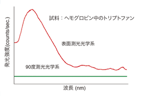 2 つの光学系(表面測光と90 度測光)の蛍光スペクトル比較