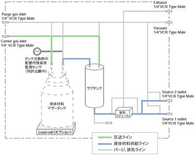 マザータンク交換時の配管内部(タンクバルブ~ラインバルブ)に残留する液体材料をマザータンクへと送り返します。そして配管内に微量に残留している液体材料を効率良く、確実に取り除くためにシンプルなガス系を採用しパージ効率を向上させると共に、残液の蒸気圧を確認する新機能:材料残留モニタを標準搭載しています。