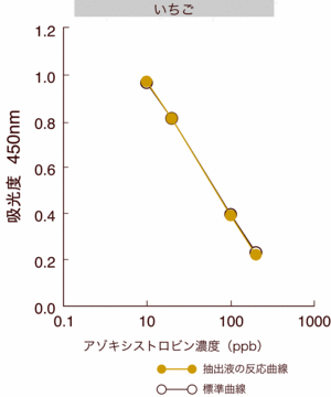 図は、アゾキシストロビンを添加した各農産物のメタノール抽出液(10%メタノール相当に希釈)を用いて反応曲線を描き、10%メタノール標準曲線と比較したものです。両者が一致していると、その農産物抽出液の影響なくアゾキシストロビンを測定可能といえます。