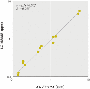 図は、イプロジオンを添加した各農産物のメタノール抽出液(10%メタノール相当に希釈)を用いて反応曲線を描き、10%メタノール標準曲線と比較したものです。両者が一致していると、その農産物抽出液の影響なくイプロジオンを測定可能といえます。