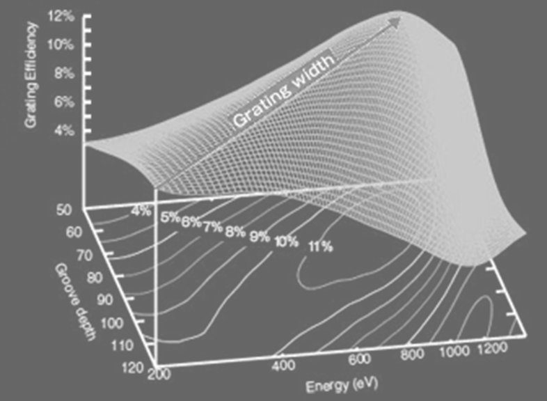 ※ 溝の深さが一定ではなく、溝方向に沿って変化しているため、光を当てる場所を変えることにより、効率分布を変化させることができるグレーティング。 -