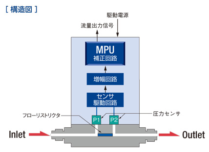 XF Seriesの流量計測(差圧式測定方式)は、フローリストリクタの前後に配置された圧力センサの圧力差を検出し、ハーゲン・ポワズイユの法則を用いて流量に換算しています。