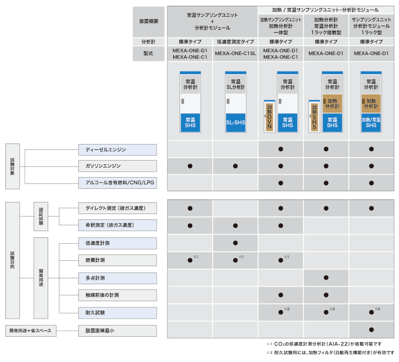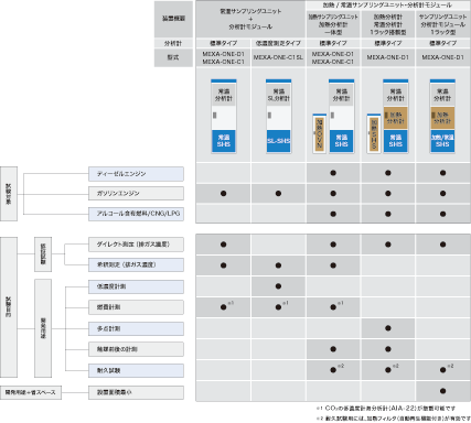 MEXA-ONEは、測定目的に応じて、サンプリング方法や搭載分析計を、計測目的にあわせた幅広いラインアップから選択できます。