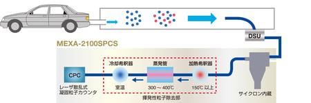 MEXA-2100SPCSは、CPC(レーザ散乱式凝縮粒子カウンタ)を検出器とし、エンジン排ガスに含まれる固体粒子のうち一定の粒径範囲の粒子数をリアルタイムにダイレクト計測する最新の粒子数測定装置です。