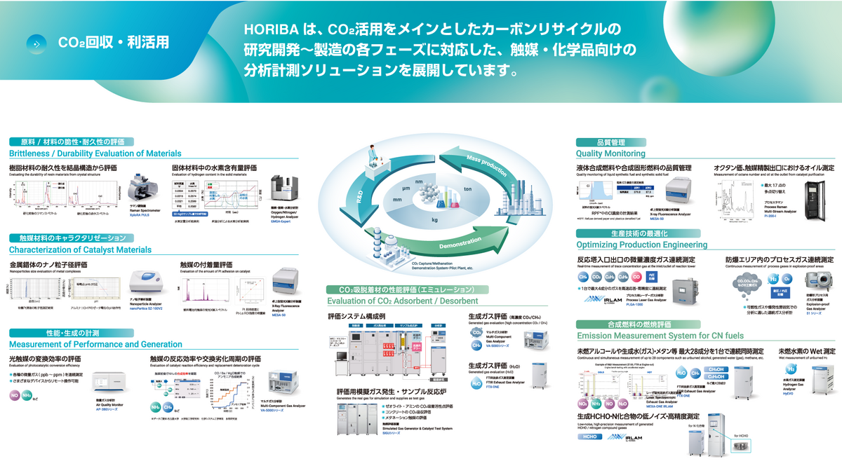 HORIBAは、カーボンリサイクルに関する触媒の研究開発~触媒を使用したプロセスによる最終製品製造に関して、さまざまな分析・計測・試験評価のソリューションで支援します。