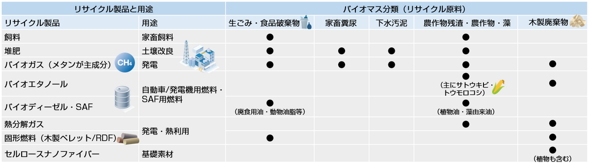 バイオマスのリサイクルから生まれる製品の中でも、バイオエタノール、バイオディーゼル、SAF(Sustainable Aviation Fuel(持続可能な航空燃料))は、自動車や航空機等のモビリティ燃料として使用されています。またバイオマスから得られるバイオガス、熱分解ガス、廃棄物由来の固形燃料は、バイオマス発電における燃料として利用されています。