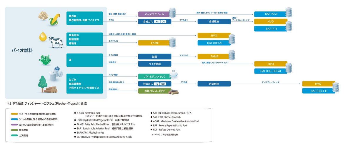 バイオマスから製造される燃料(バイオ燃料)には、自動車や発電機用の液体燃料として従来のディーゼルと混合して使用するバイオエタノール、バイオディーゼル(FAME: Fatty Acid Methyl Ester)、水素化植物油(HVO: Hydrotreated Vegetable Oil)があり、今後は従来燃料との混合率が向上していく方向です。また航空機燃料用バイオ燃料であるSAF(Sustainable Aviation Fuel(持続可能な航空燃料))は、使用原料や製造プロセスによりATJ(Alcohol-to-Jet)、HEFA(Hydroprocessed Esters and Fatty Acids)、FT(Fischer-Tropsch)等に分類され、従来燃料との混合率の上限が決められています。混合率の向上や代替を促進するには、バイオ燃料の製造コスト低減、熱量の向上、腐食性の低減等に加え、安定的な原料確保・供給のためのサプライチェーンの確立・改善も必要です。
