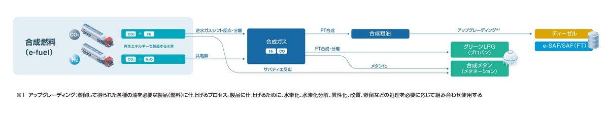 合成燃料の製造は大きくは2つのプロセスで構築されています。一つは、CO2と水素または水より合成ガス(H2・CO)を製造するプロセス、もう一つは、製造された合成ガスより合成燃料製品を製造するプロセスです。
