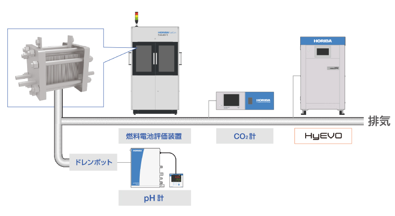 また、排気される凝縮水中の水質計測や排気ガス中のCO2を計測することで、燃料電池の劣化度合を評価できます。