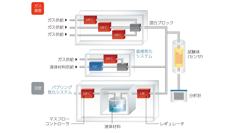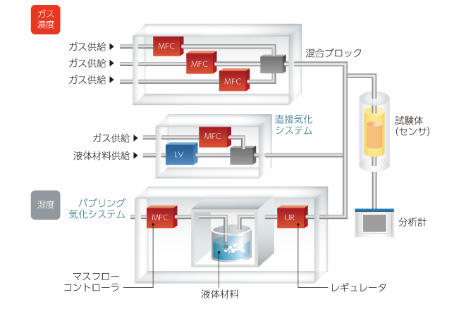 燃料電池の開発では、さまざまな条件下の混合ガスを模擬的に作り、そのガス流量を制御して燃料電池に供給し、試験や評価を実施します。それには、高精度な気化装置、混合装置、流量制御装置が必要です。HORIBAは、半導体プロセスにも使われる流量制御技術を有し、ガス濃度・湿度の正確なコントロールで燃料電池開発・試験をサポートします。詳しくはこちらをご覧ください。