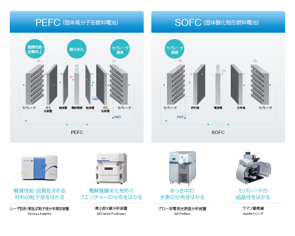 HORIBAは、燃料電池(FC: Fuel Cell)の材料評価から生産プロセス、セル・スタックの性能評価まで、幅広い技術でお客様の開発・製造を支援します。