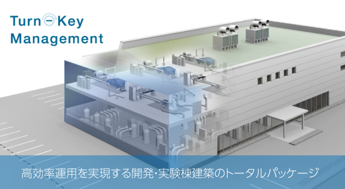 実験棟施工のトータルパッケージであるターンキーソリューションでは、複数業者への発注、仕様決定に至るまでの打ち合わせ、建築の安全・工程・品質管理、さらに導入後の運用・メンテナンスや作業の高効率化まで、安全性と使いやすさを重視しながら、試験室運用開始の直前まで忙しいお客様にかわりHORIBAが一括で施工を承ります。