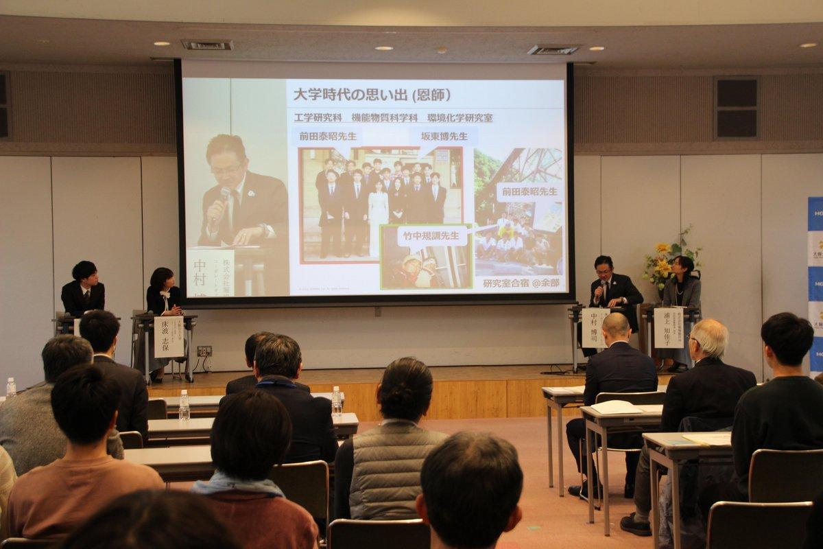 トークイベントでは、公立大 床波准教授・植田研究員、公立大の前身、大阪府立大学の卒業生である堀場製作所 コーポレートオフィサーCTO 中村・知的財産戦略部長 浦上が登壇し、それぞれの研究内容や在学当時での思い出を語りました。