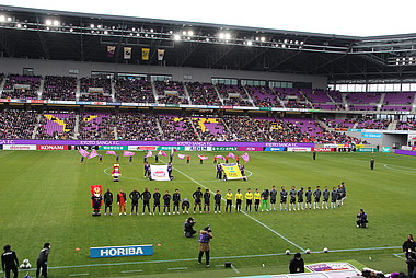 2月19日、サンガスタジアム by KYOCERAにおいて京都サンガF.C.(以下、京都サンガ)の2022年シーズン開幕戦が行われました。12年ぶりにJ1の舞台で戦う京都サンガ、初戦の相手は昨年の天皇杯を制した浦和レッドダイアモンズ(以下、浦和レッズ)です。浦和レッズは2009年に京都サンガのJ2降格が決まった試合の対戦相手で、J1復帰の初戦も浦和レッズというドラマチックな巡り合わせとなりました。 この日を待ちわびていた京都サンガサポーターは熱いエールをピッチ上の選手に送りました。 この開幕戦にHORIBAから京都府在住の有志が集い、京都サンガの応援に加勢しました。