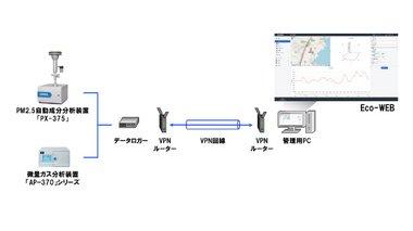 「Eco-WEB」は、計測装置と管理用パソコンをつなぎ、本ソフトウェアを使用して遠隔地から大気環境のデータ収集、管理、可視化、レポート作成を可能にします。今回、お客様はPX-375に加えて、大気ガス分析装置AP-370や風向風速計のデータも同時に「Eco-WEB」上で表示することを希望されました。この希望を叶えるために課題となったのは、「Eco-WEB」と通信する、さまざまな計器が持つデータ時間を揃えることです。簡単に聞こえますが、AP-370と風向風速計は秒単位の連続した情報を取得し続けるのに対し、PX-375は1時間に1データといった不連続な情報です。特にPX-375は質量分析結果と成分分析結果が数十分程度ずれたタイミングで出力され、それらと毎秒出力のデータを自由な時間、つまりお客様の見たいタイミングで出力することが困難でした。そこで、データ通信時に、計器の測定データと合わせて、不連続測定における遅延の時間情報も一緒に通信することで解決へ導きました。(特許出願済)
