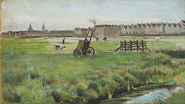本作品は20代の若きゴッホが、オランダのハーグ郊外にある田舎の牧草地を描いた水彩画です。ゴッホは油彩作品を多く残していますが、当時は水彩画の可能性に興味を持ち、表現の幅を広げようと模索していた時期です。勉強熱心だったので、教則本に書かれている技法を試したり、使用する紙を変えたりと実験を繰り返していました。