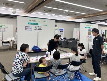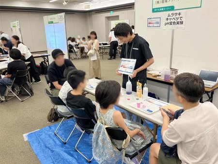 9月7日に京都産業会館ホールで開催された学びEXPO2025 in KYOTOの体感エリアに出展し、未就学児から中学生までを対象にpH計を使った授業を行いました。