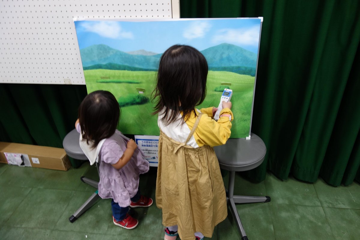 放射温度計のコーナーでは、ボードに描かれた草原のなかに隠れているうさぎを、放射温度計を使って探すという「はかる」体験をしてもらいました。