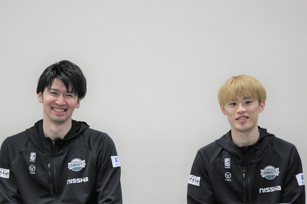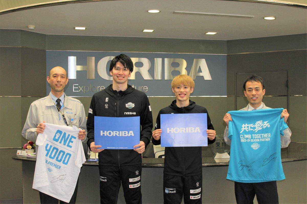 勝利への機運が高まるなか、京都ハンナリーズのプラチナパートナーであるHORIBA本社に、澁田 怜音(しぶた れおん)選手と鈴木 悠介(すずき ゆうすけ)選手が表敬訪問のためご来社されました。シーズン前半戦の振り返りと、後半戦に向けての抱負を両選手に伺いました。