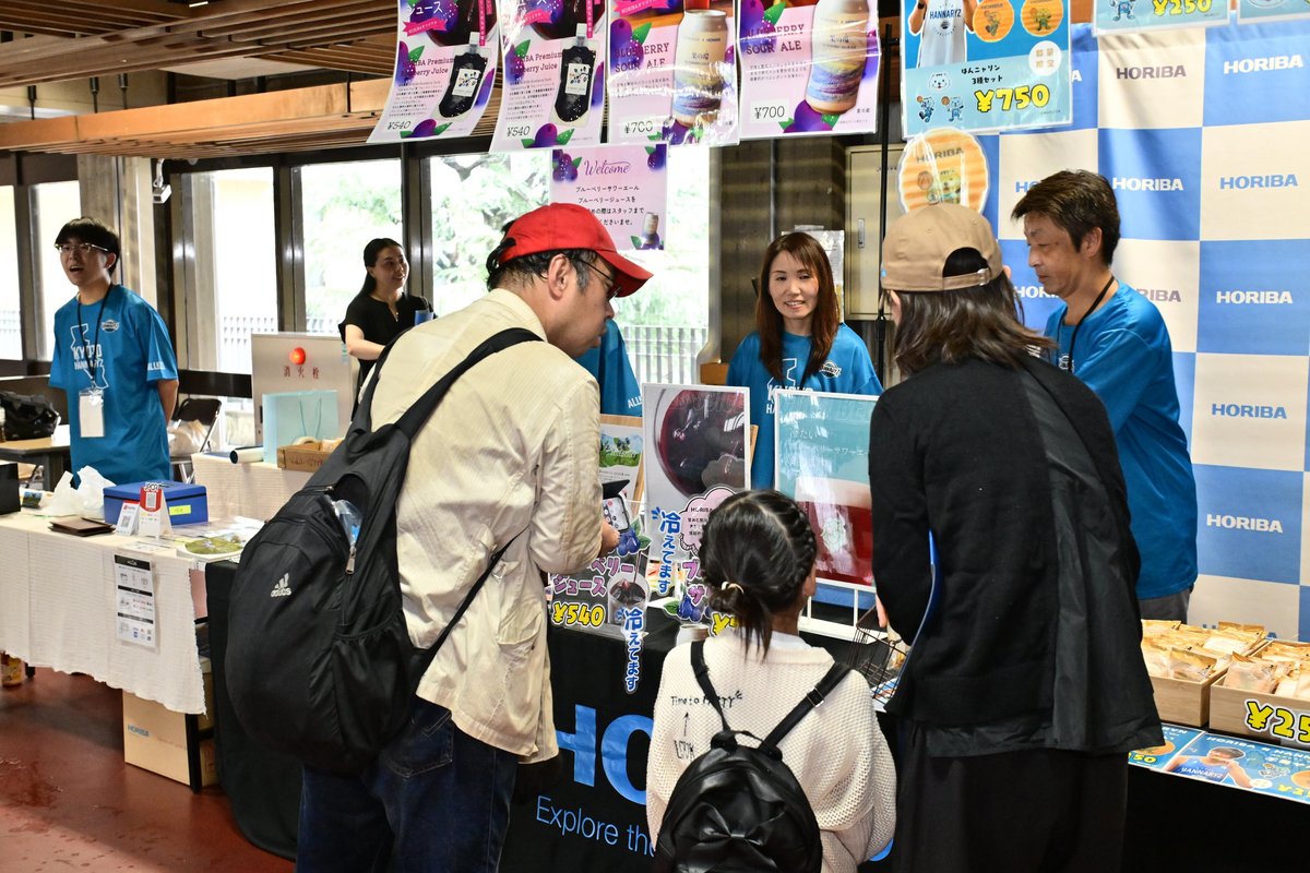 入場ゲートを入ってすぐのHORIBAブースでは、自社農園「HORIBA Blueberry Farm」産のブルーベリージュースやジャム、サワーエールなどを販売し、商品を購入された方を対象に、京都ハンナリーズ全選手サイン入り2025-26シーズンポスターなどが当たる抽選会を実施しました。開場直後からブース前には長い列ができ、当選者の喜ぶ姿に周囲から拍手が上がるなど、終始にぎやかな雰囲気でした。
