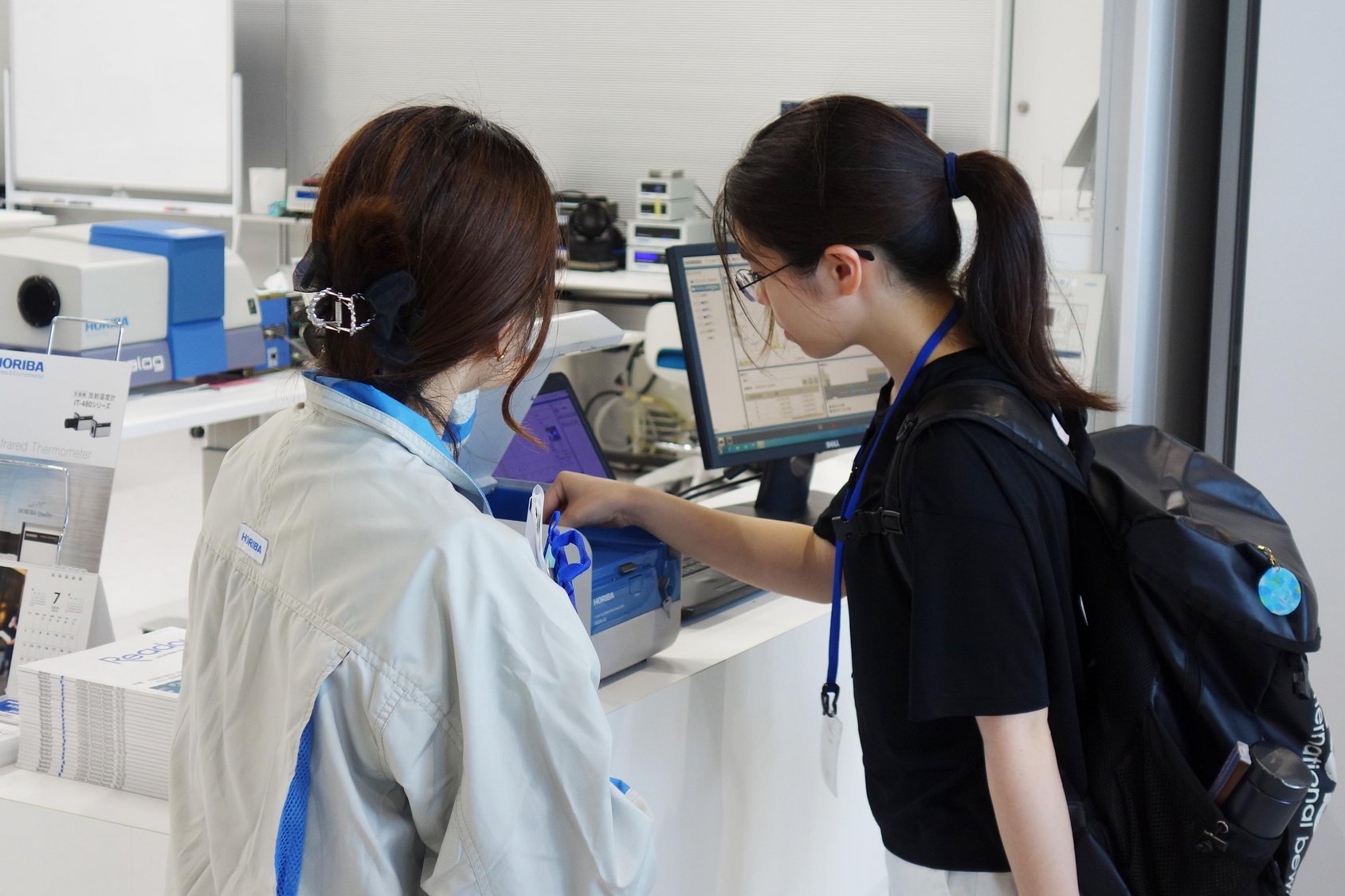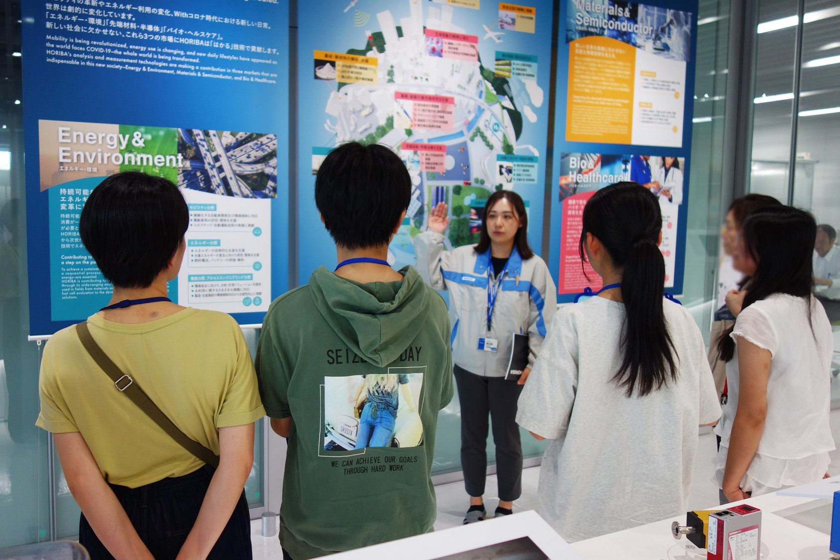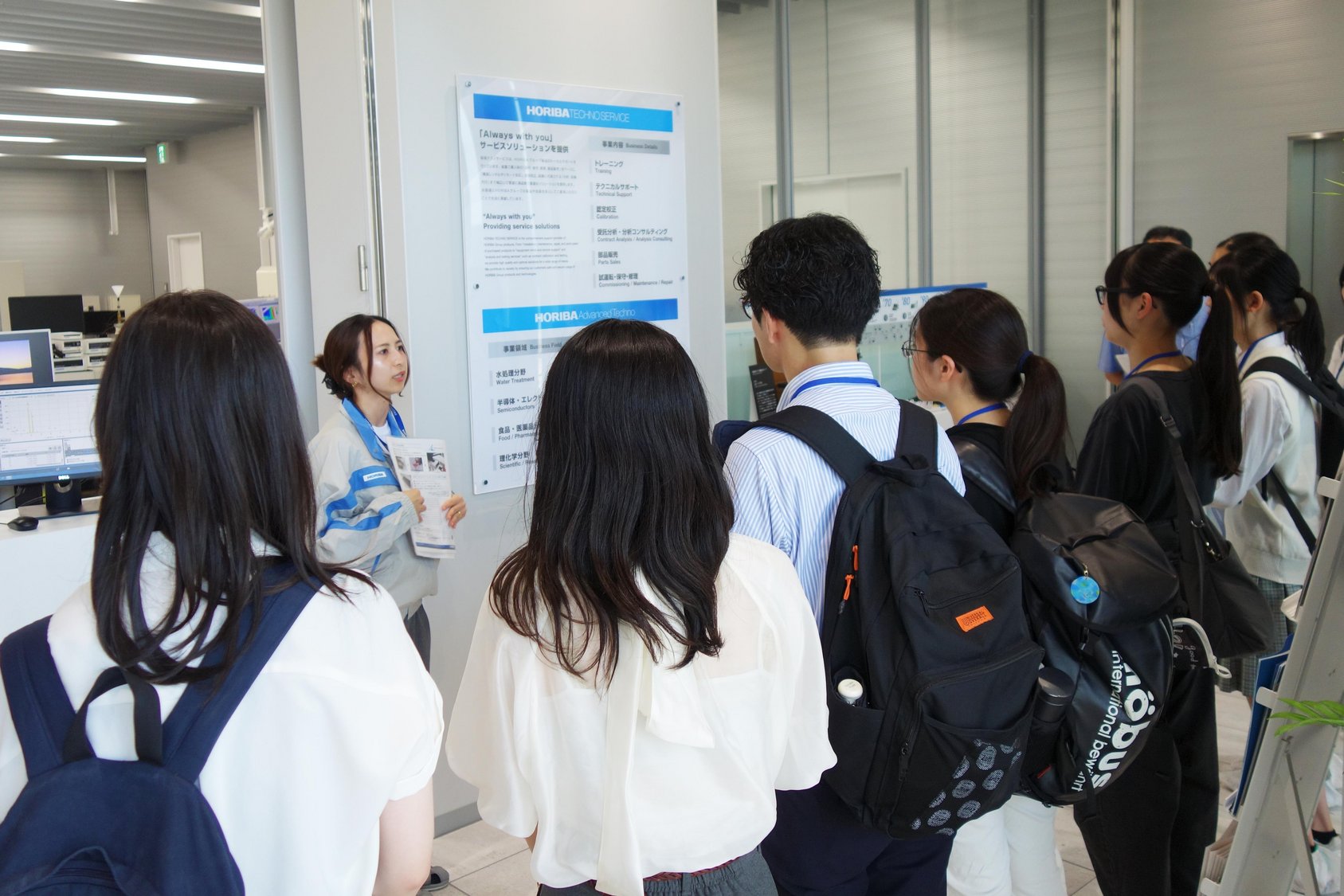 まず、HORIBAの製品が社会でどのように活用されているかを説明した後、製品デモや研究開発、受託分析を行う分析施設「Analytical Solution Plaza」を見学していただきました。普段はなかなか目にすることのできない最先端の技術や製品、職場の雰囲気、そして技術者の働く様子を実際に体感してもらいました。