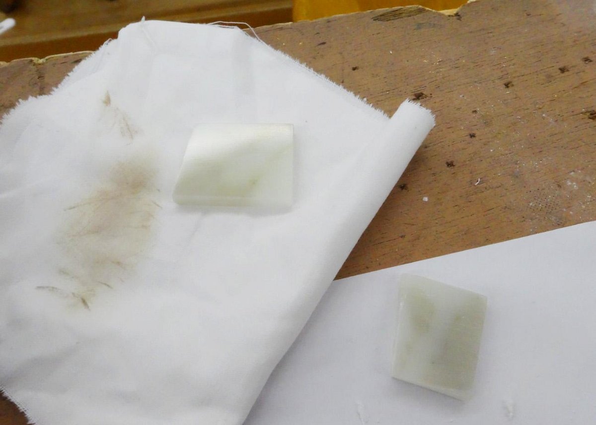 「これで十分かな?」と思ったら、次に裏面の作業に進みます。裏面では、ある程度磨いた段階で光沢計を使って測定し、事前に用意した基準値をめざしてさらに磨きます。基準値に達したら、だんだんと目の細かいやすりに切り替えて仕上げを行う、という流れで進めました。