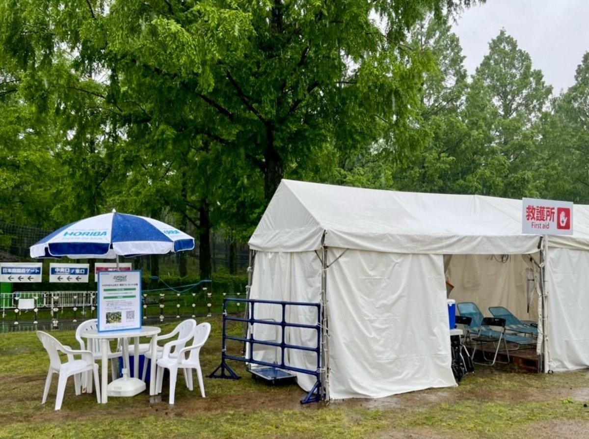HORIBAのイベントブースは会場内の救護所横に立つHORIBA柄のパラソルが目印です。大雨のなか準備をしながら、公式X担当者2名は初めての企画で落ち着かない気持ちに加え、「こんな大雨で参加していただけるのだろうか」という不安を抱えていました。