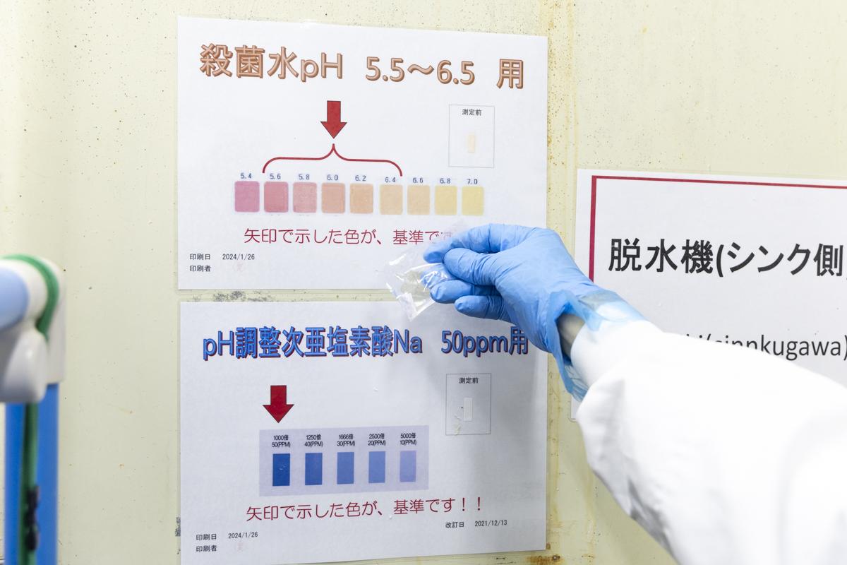 殺菌・洗浄工程では、次亜塩素酸ナトリウムや微酸性電解水などによる殺菌・洗浄を重要管理工程としてその塩素濃度を管理し、記録しています。