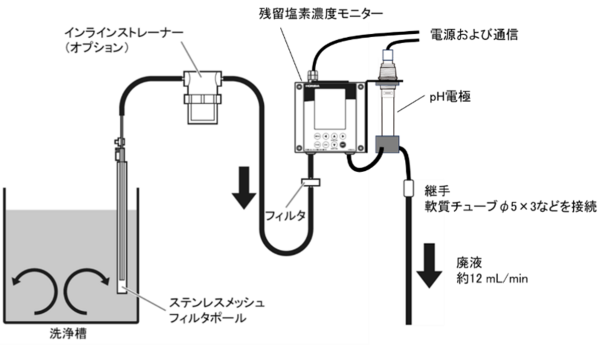 そうした加工工場での現状を知り、HORIBAはカット野菜洗浄工程における衛生管理の向上とデジタル化に貢献する製品として残留塩素濃度モニター「UP-400CL」を開発しました。本製品はカット野菜の殺菌・洗浄工程※2において洗浄槽中の塩素濃度やpHを連続的に数値化し、設定値を下回った場合にはアラートで知らせるなど、野菜殺菌管理システム※3を構築することができます。また、本製品は有効塩素の中でも特に殺菌効果が高い遊離塩素※4のみを連続的に測定します。