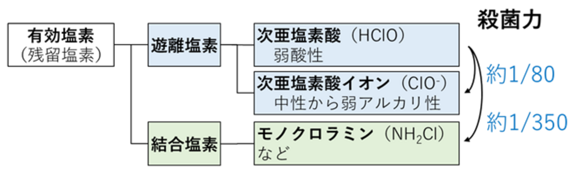 遊離塩素のなかでも次亜塩素酸(HClO: 弱酸性域での存在形態)の殺菌力が最も高く、次亜塩素酸イオン(ClO-: 中性から弱アルカリ性域での存在形態)だと約1/80に低下します。有機物への結合後は、次亜塩素酸に比べ約1/350 に低下するため、殺菌効果を適切に維持するには遊離塩素濃度の連続的なモニタリングが有効だと考えられています。