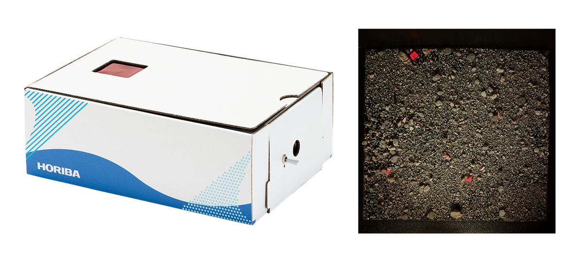 マイクロプラスチック簡易学習キット「ぷらウォッチ」。 ぷらウォッチの赤い窓部分から染色された砂を観察すると、プラスチックだけが赤く光ってみえる