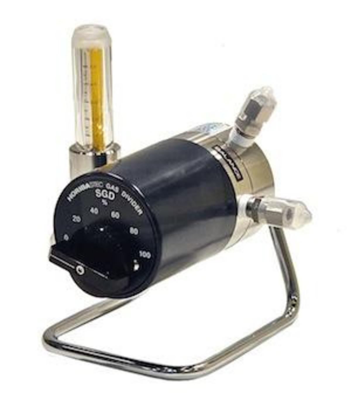 標準ガス分割器(型式SGDシリーズ 以下SGD)はガス分析計を校正するための標準ガスの発生器で、1975年から販売している製品です。主な用途は規制基準の下での大気汚染や自動車排ガスのガス分析です。1981年に制定された環境大気や排ガス用分析計の5等分割校正曲線の作成方法を定義したJIS K0055に適合し、公害対策に貢献しました。分析計のスパンガスとゼロガスを接続し切り替えコックを回すだけの簡単操作と、切り替えブロックに内蔵された定差圧調圧器と5本の毛細管だけで構成されたシンプルな構造が特徴です。初期タイプは標準ガスの消費量が比較的多い機構でしたが、消費量の少ない排気レスタイプの開発に成功し、また米国基準に合致した6分割、8分割、10分割などのシリーズを発売し、現在も生産販売を継続しています。