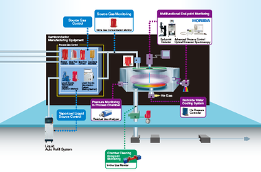 1980年,堀場エステックは日本初の純国産マスフローコントローラ(以下MFC)を上市しました。その後,SEC-400シリーズ,SEC-4400シリーズといったMFCがリリースされ,世界各国の半導体製造装置メーカー,半導体デバイスメーカーのお客様にその性能と品質が認知されるようになり,これまでそれぞれの時代に合った半導体プロセスに求められるMFCを継続して開発,製品化しています。今日,堀場エステックの半導体プロセス関連の製品群はMFCだけにとどまらず,プロセスチャンバー周辺で使用される流量,圧力,濃度等の測定,制御に用いられています(Figure 1)。また近年は,単なる部品,コンポーネントだけではなく,お客様にソリューションを提供すべく,モジュールやサブシステムの形で提供されている製品も増加しています。