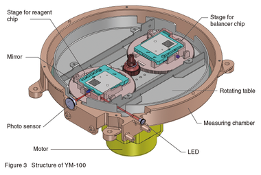 糖尿病の指標であるヘモグロビンA1cや炎症マーカーであるCRPを微量の血液で簡便に測定できる検査装置を開発した。μTAS技術を応用して設計された使い捨てのプラスチック製チップを使用しており,検査室にある大型装置で一般的に行われている血液の遠心分離から試薬との反応,光学測定までの一連の分析操作をチップ内で実現している。これにより装置は小型だが高精度な測定が可能となっている。本稿では,チップと装置の構造やユニークな測定原理,μTAS化がもたらす利点を紹介する。