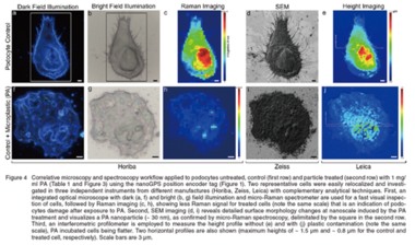 現在,我々は食品や大気を通して,マイクロ〜ナノサイズという非常に小さい粒子(MNPs)に日常的に曝されている。しかしながらどの程度曝されているのか,またそれが我々の健康にどの様な影響を及ぼしているかは,ほとんど知られていない。我々は,HORIBAが開発したnanoGPSとParticle Finderの2つの技術を使い,測定対象に対し,正確に位置合わせを行うことで,独立した機器で同一のMNPsをナノスケールまでかつ広範囲にわたり解析を実現した。本項では,容器入り天然水と,粒子の蓄積が起こりやすい代表的な腎臓細胞として培養ヒト有足細胞の2つについて解析を行った結果を示す。まず,リファレンス粒子及び天然水ボトルにふくまれるMNPsを検出し,ボトルやラベルの材質に依存した平均粒子数やサイズ,種類に関する統計解析を行い,その性能を実証した。次いで,ヒト由来ポドサイトに対するMNPs(3種の標準粒子と摩耗タイヤから得た粒子使用)の主な影響は細胞生存率試験で評価され,その同じ細胞を相関顕微鏡法と分光法で解析した(顕微画像とスペクトル測定の同期技術により,対象細胞に関する複数の情報を同一視野角で取得している)。MNPsと共に調製された細胞と無調製の細胞を比較し,MNPsの付着や取り込みによる細胞へのダメージに帰属できる状態の変化を観察し,MNPsの生物学的特徴を評価した。複数の機器を用いた測定により,同一の測定対象の位置合わせだけでなく,自動化できる本技術は,本事例にとどまらず,広く活用が期待される新規分析手法である。