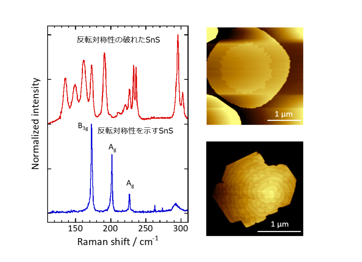 二次元材料はレイヤー・バイ・レイヤーで成長するため、分極の向きが打ち消しあいます。バルク※9だと圧電材料にならないので、あるテクニックを使ってその分極を揃えます。揃うということは空間反転対称性を破っているので圧電特性を得ることになりますから、環境発電に使うことができます。対象とする物質がそうした特性を得ているかどうかをラマン分光装置で調べています。分極が反転していて、空間反転対称性をもつ結晶と、空間反転対称性が破れ分極が全部揃った結晶ではラマンスペクトルが全く異なります。この結果を理論計算とあわせながら解析することで、さまざまな情報を得ることができます。解析できるラマン分光装置は圧電材料の研究には重要となります。圧電結晶は結晶構造を精密にコントロールしないといけないので、格子振動の観点から感度良く、非常に明確に現れるラマンスペクトルの解析はとても有効な分析手法です。