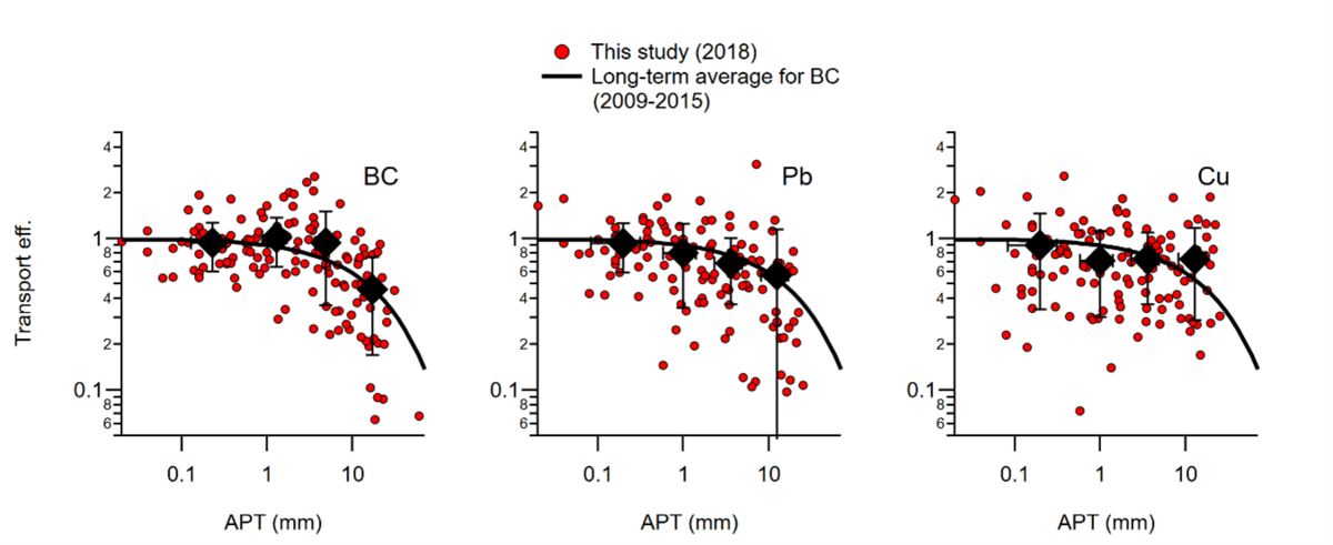 図2:PM2.5エアロゾル中のすす(BC)、鉛(Pb)、銅(Cu)の輸送効率と輸送途中の積算降水量に対する関係性(Miyakawa et al., 2023から改変。)