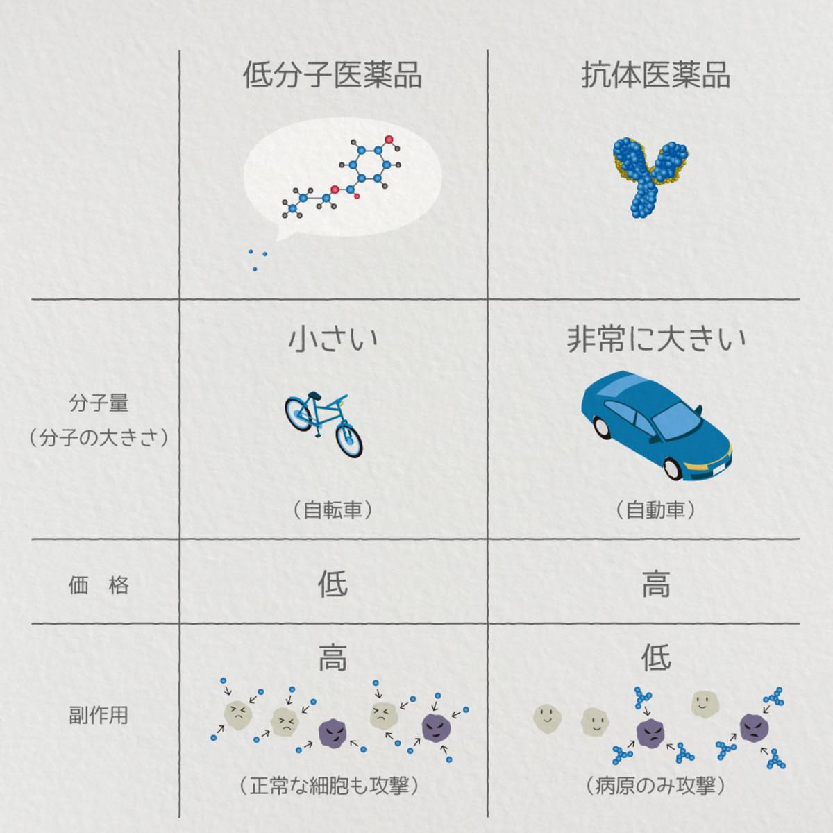 日常で風邪をひいたり、インフルエンザにかかったりした時に飲まれる薬は低分子医薬品になります。低分子医薬品は、特定の病気を治療することができるよう化学合成により人工的にデザインされたものです。抗体医薬品はタンパク質が主成分になっているので、生体親和性がよく、副作用を軽減することができます。